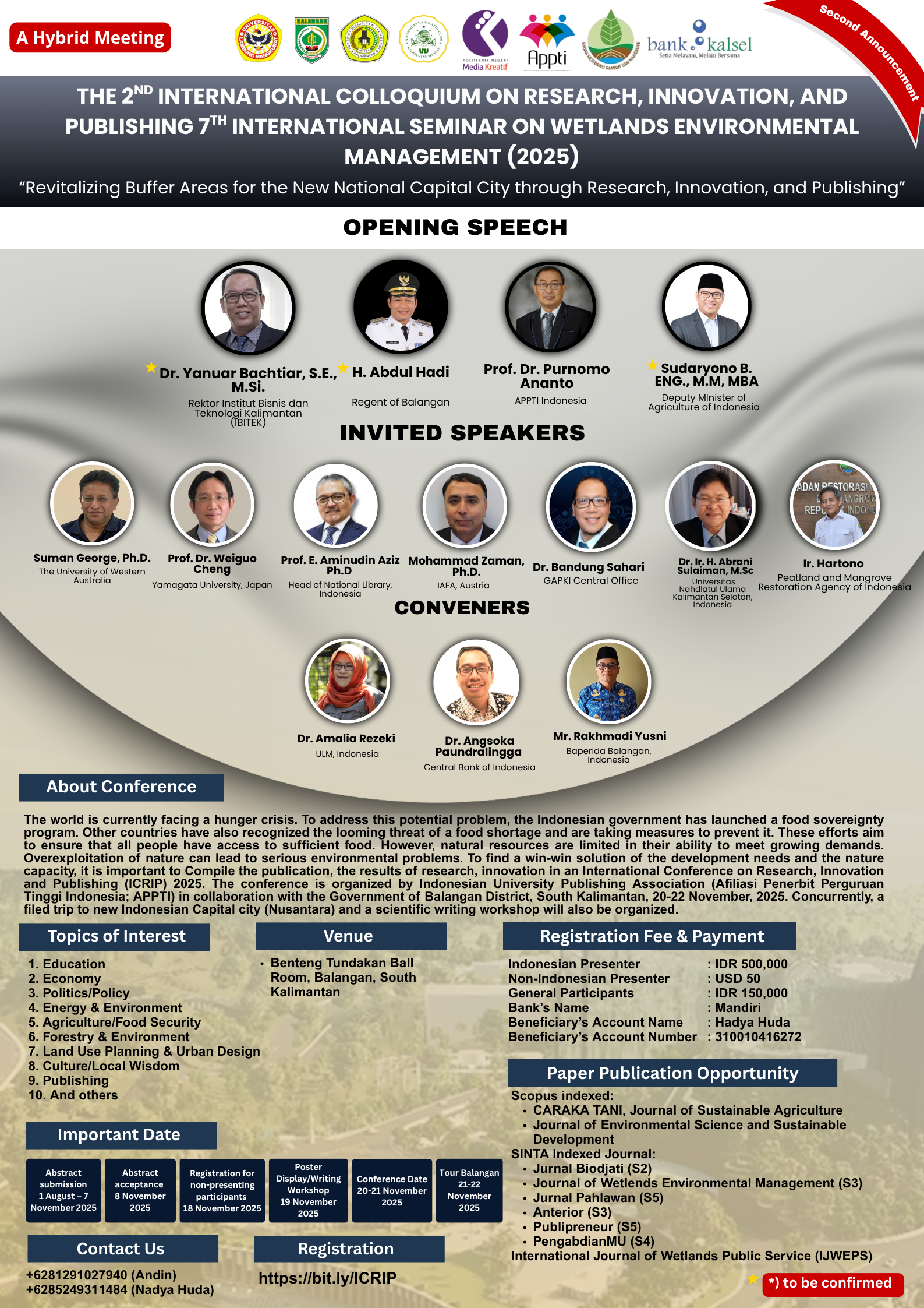 The 2nd International Colloquium on Research, Innovation, and Publishing (ICRIP) & The 7th International Seminar on Wetlands Environmental Management (ISWEM) 2025